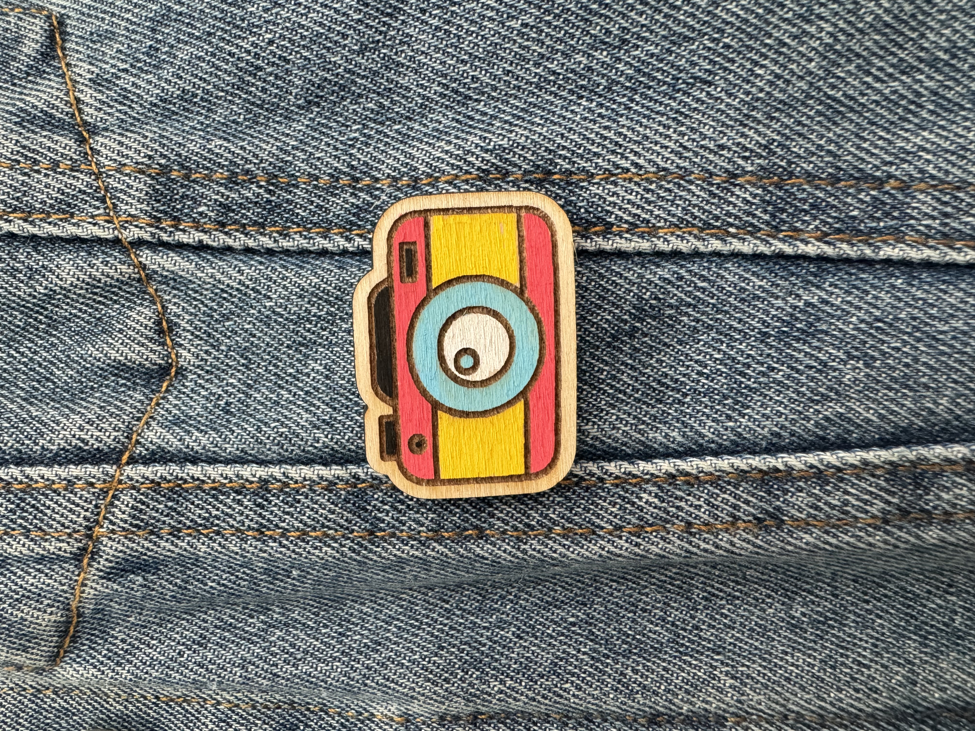 Amateur de photo ? Découvrez notre pin's en bois contreplaqué appareil photo et coloré à la main.