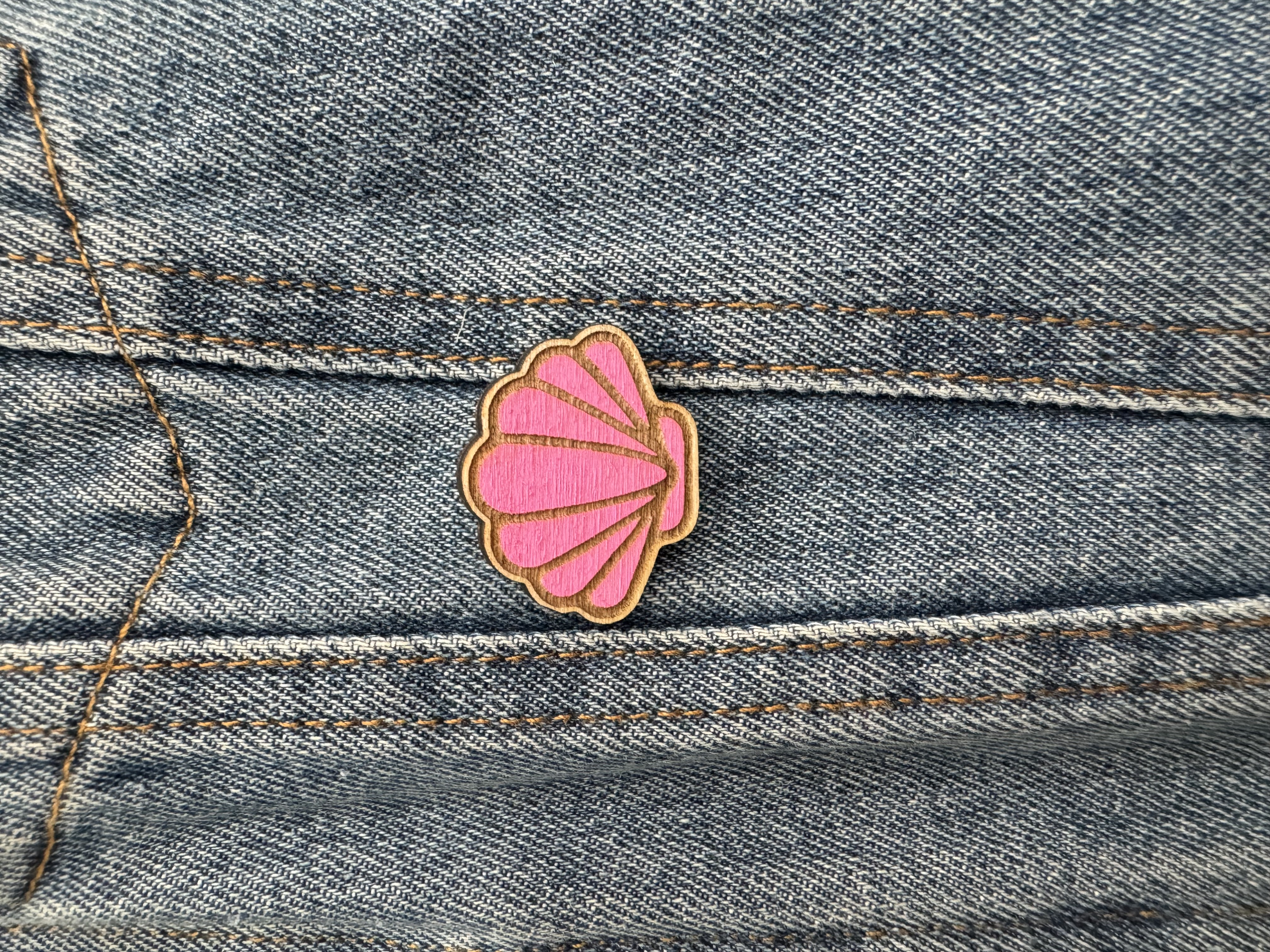 Élégant et délicat, notre pin's en bois contreplaqué en forme de coquillage et coloré à la main d'un joli rose.