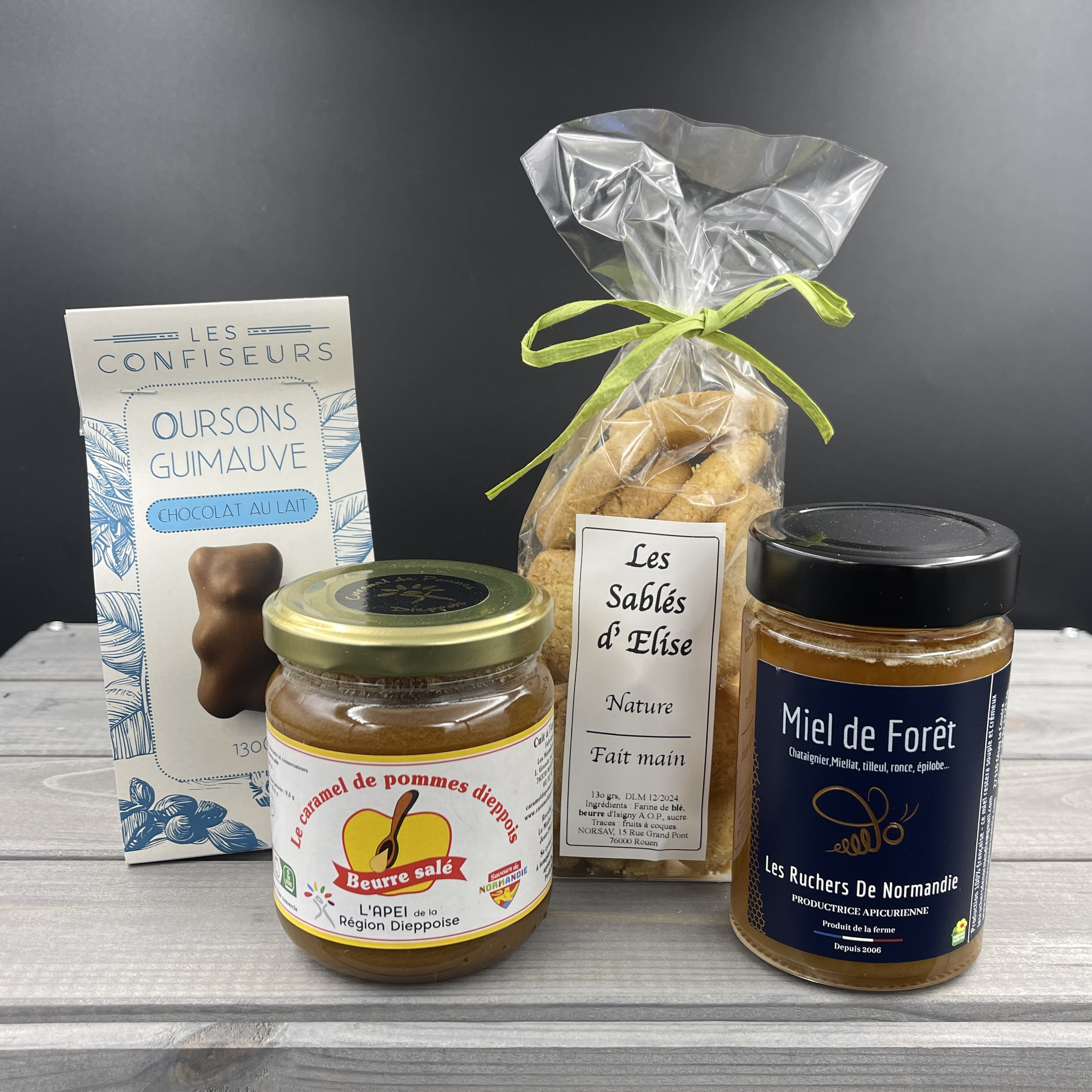 Nounours à la guimauve, caramel de pommes, biscuits "diamant" et miel savoureux, le tout évidemment produit en Normandie.