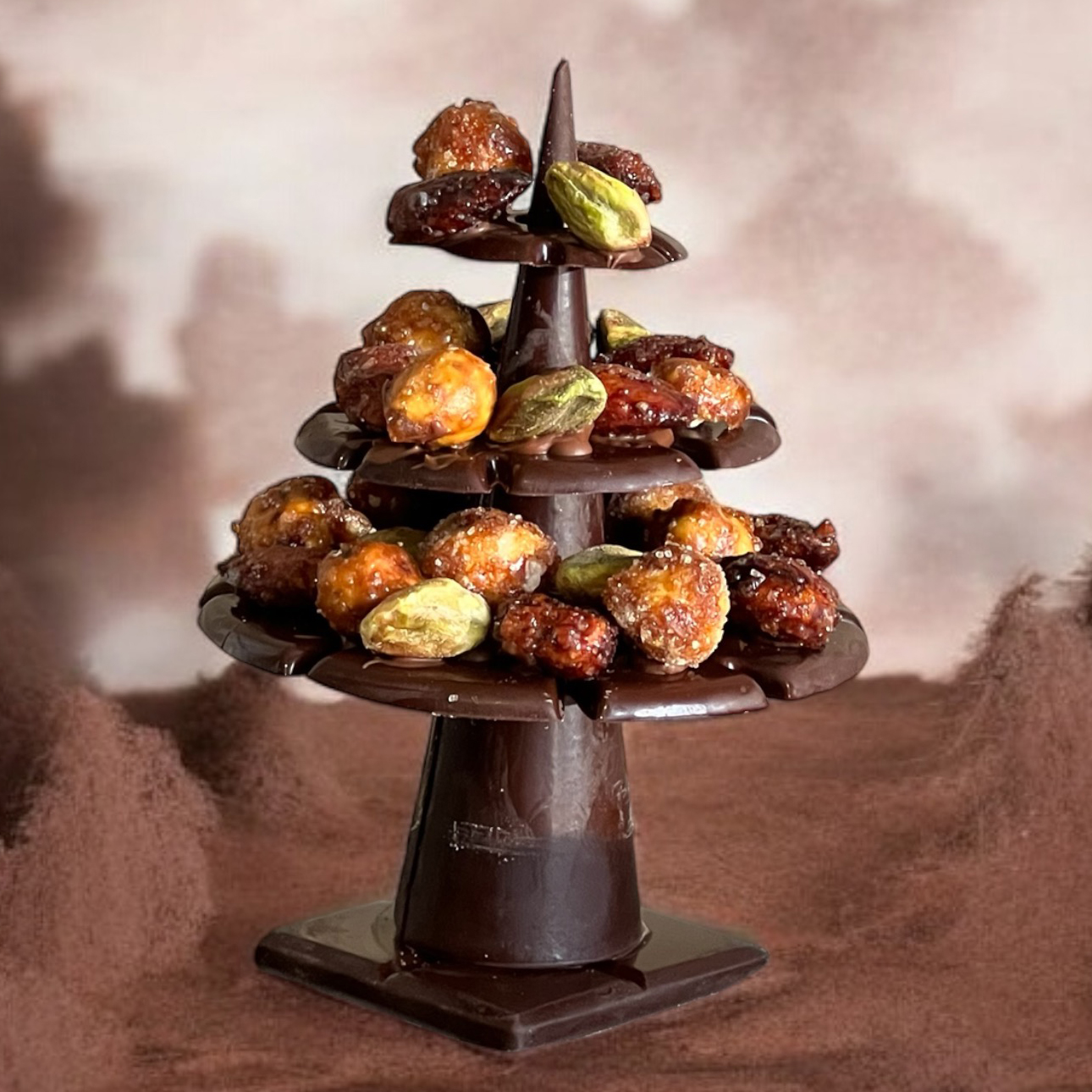 En chocolat noir 66% (pure origine Cameroun) avec des fruits secs caramélisés.